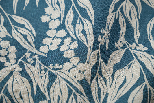 Linen Fabric - Nuts about Wattle in Slate on oatmeal linen