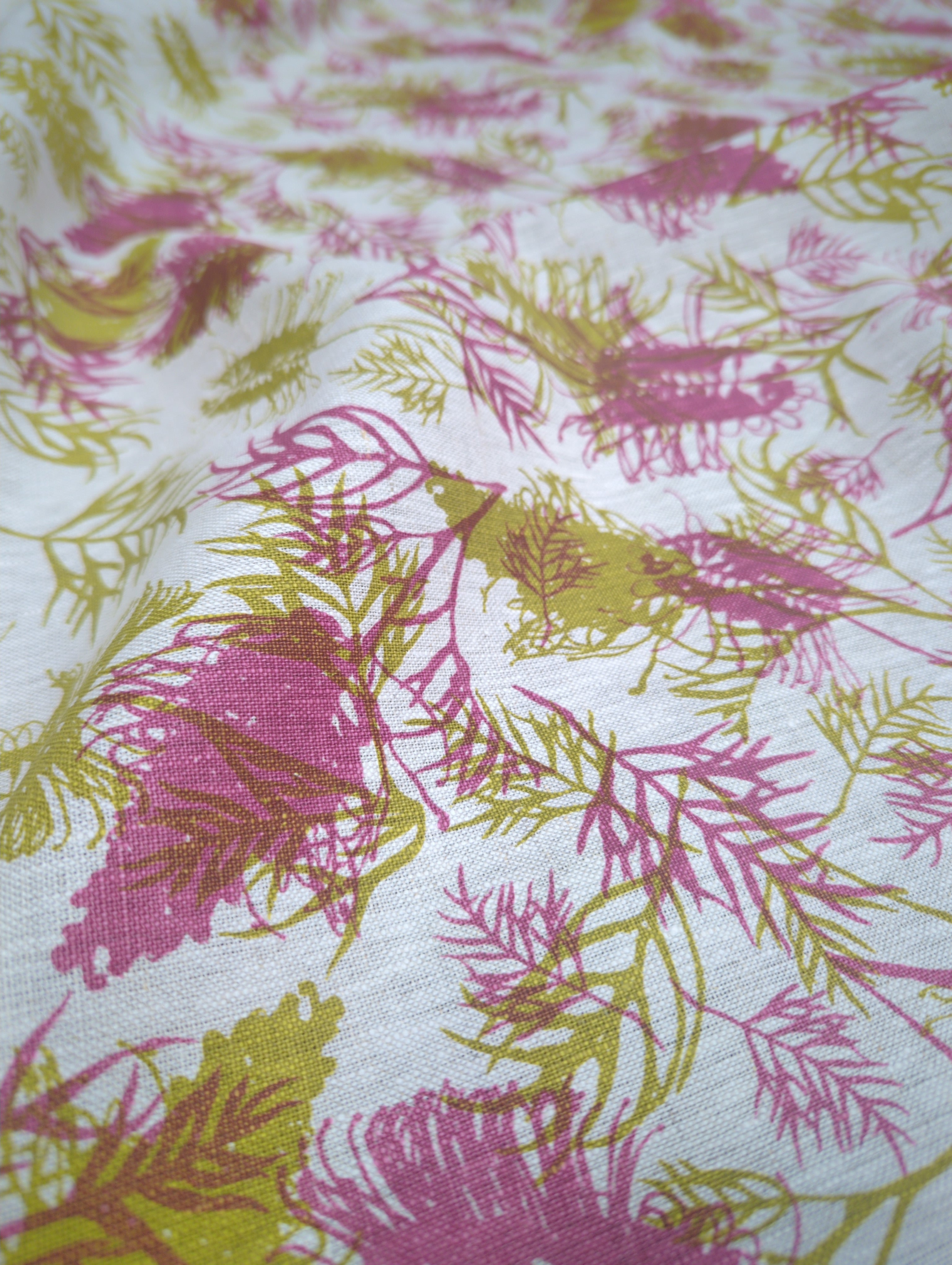 Linen FabricNew design featuring Grevilleas in Olive Oil and Grape Fiz.