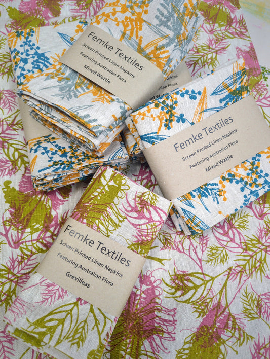 These beautiful hand printed linen napkins featuring Australian flora will brighten up any dinner party or picnic!