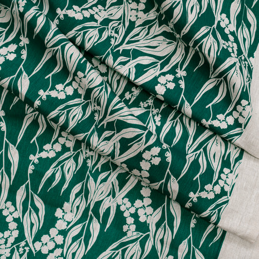 Linen Fabric - Nuts about Wattle in Verde on oatmeal linen