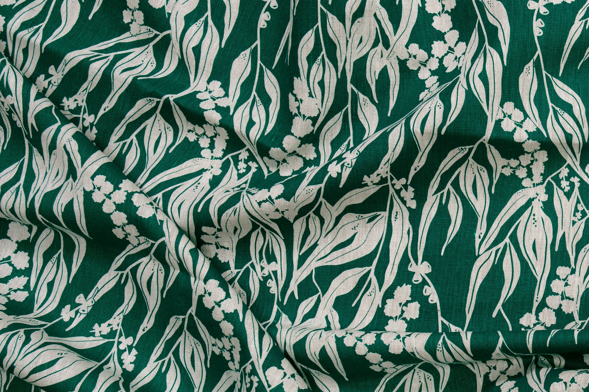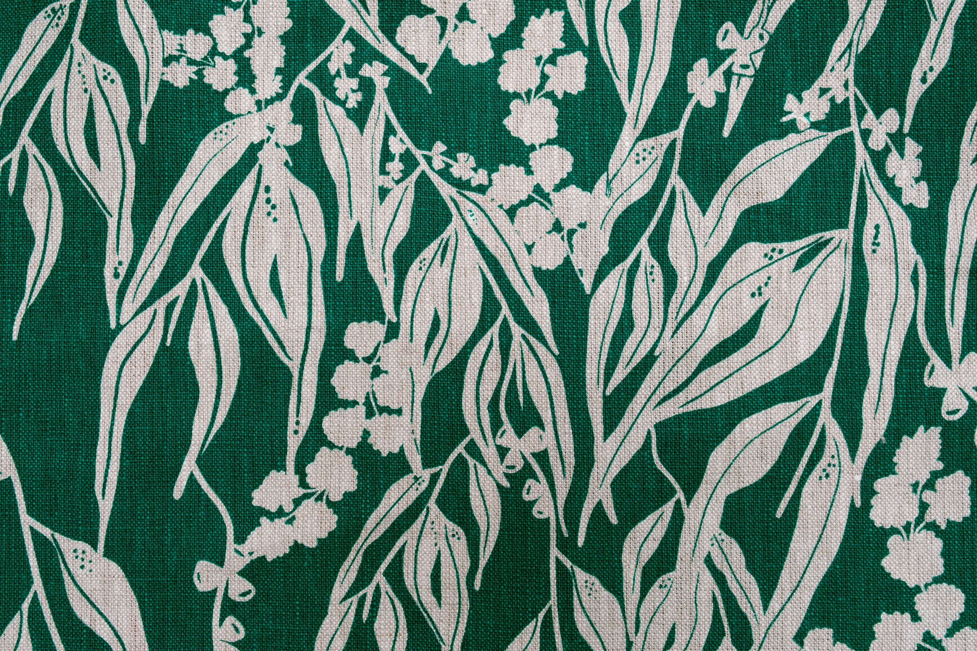 Linen Fabric - Nuts about Wattle in Verde on oatmeal linen