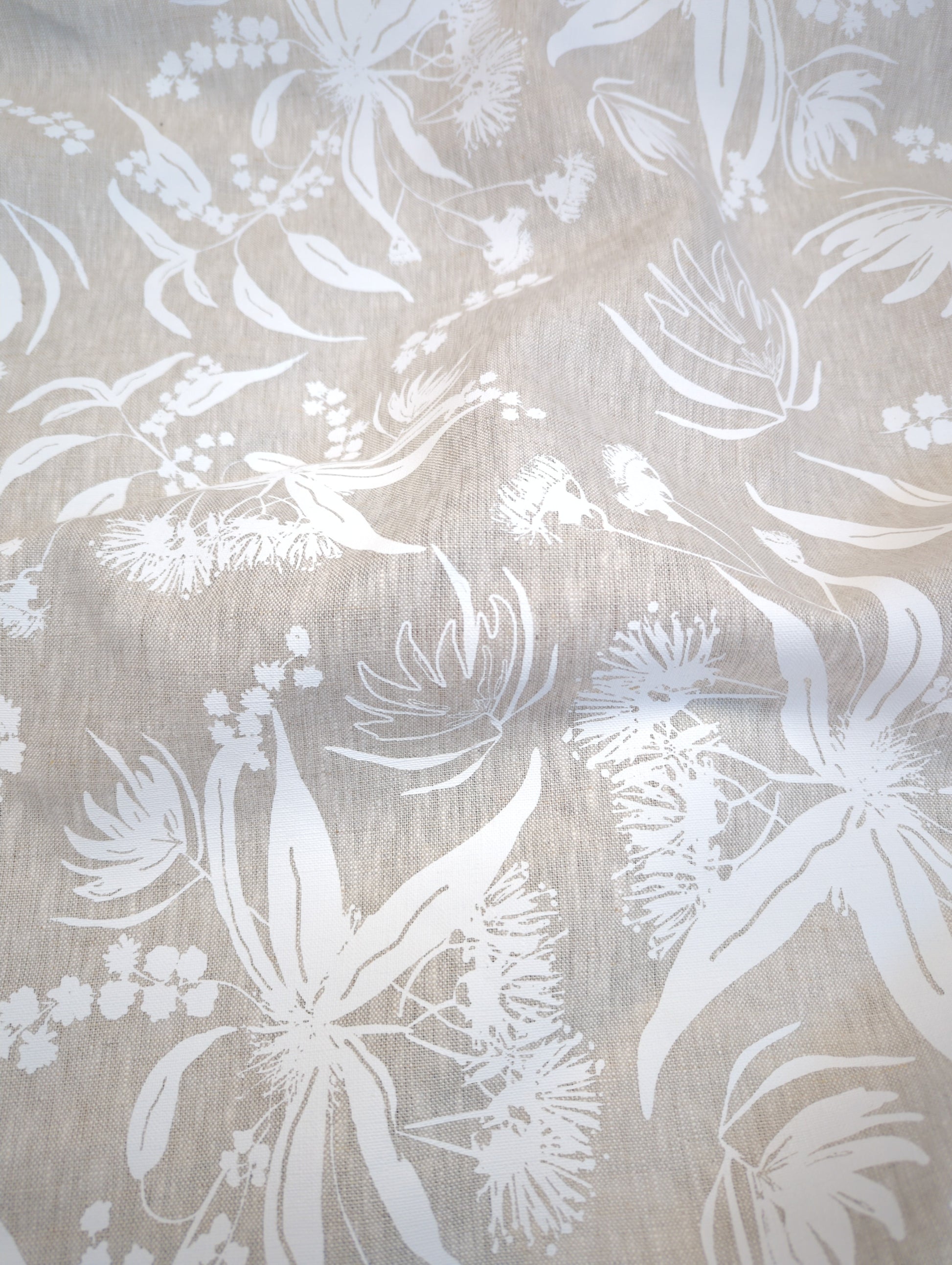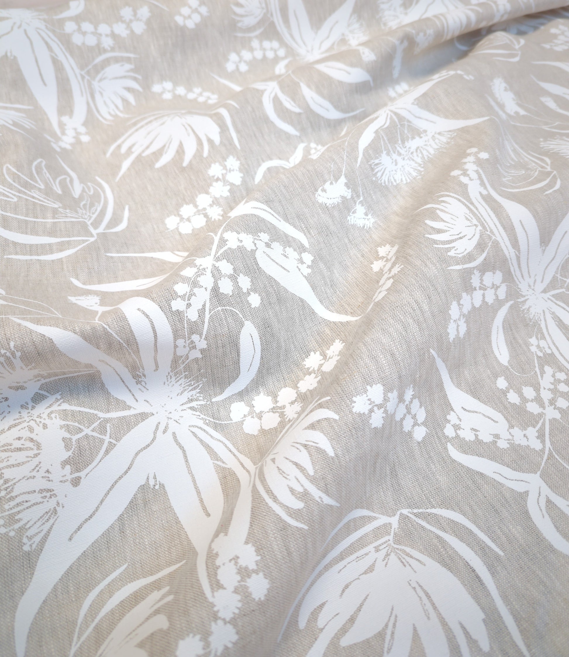 Hand screen printed linen fabric featuring Local Forage in Snow.