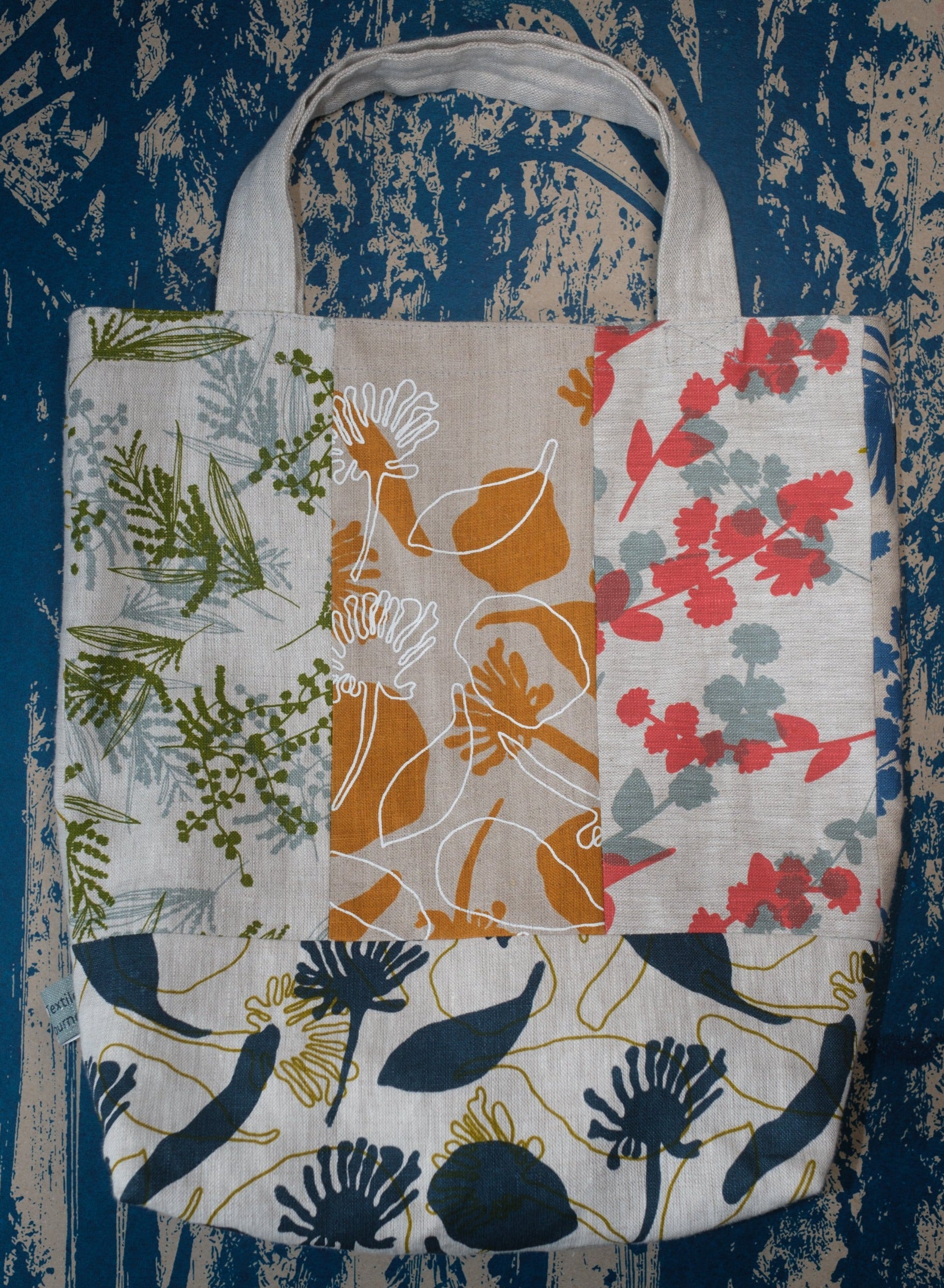 This one-of-a-kind tote bag is crafted from hand screen printed linen pieces featuring some of our favourite prints.