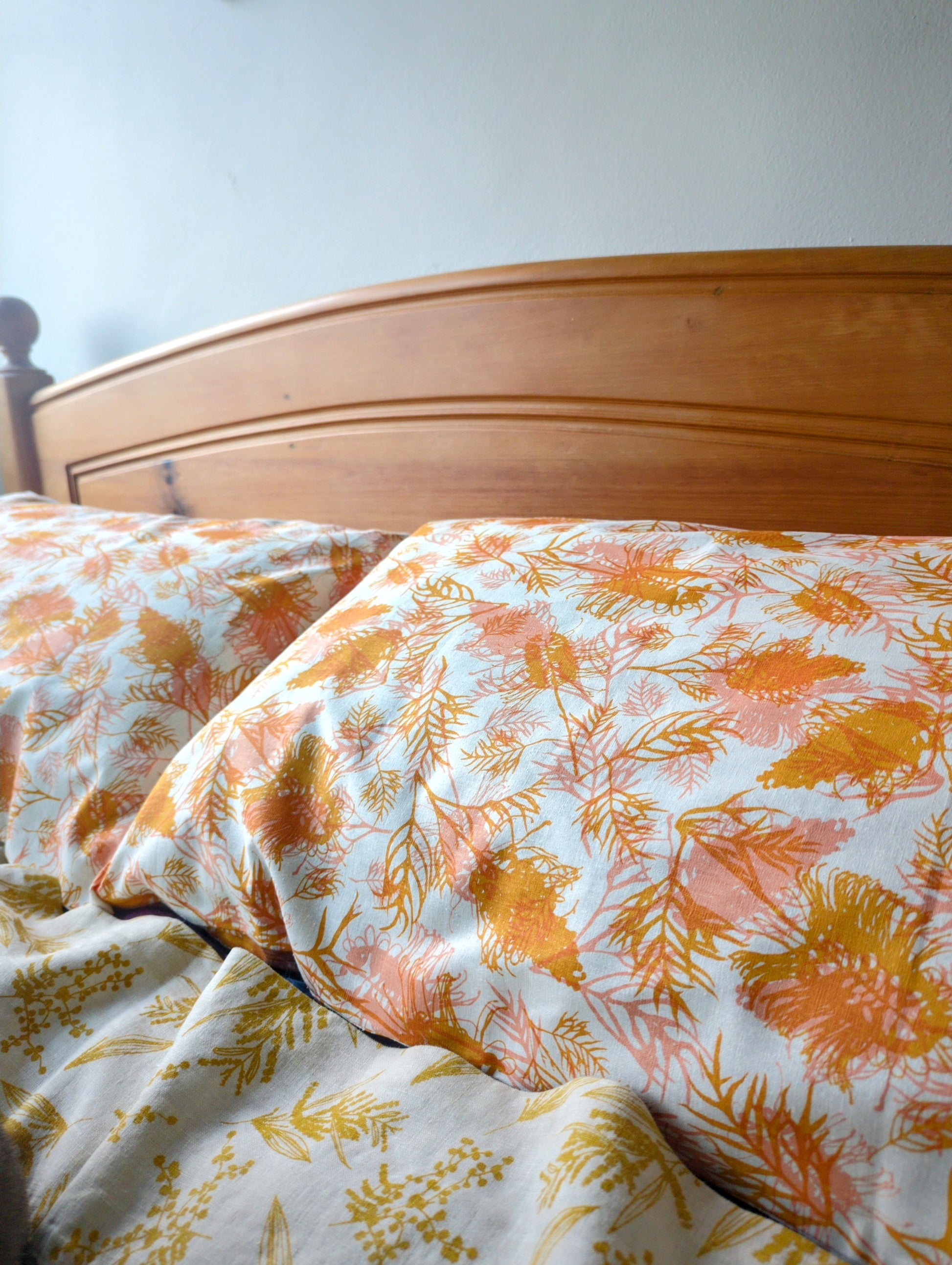 Pillowcase set featuring a new print, Grevilleas, in Melon and Tumeric.
