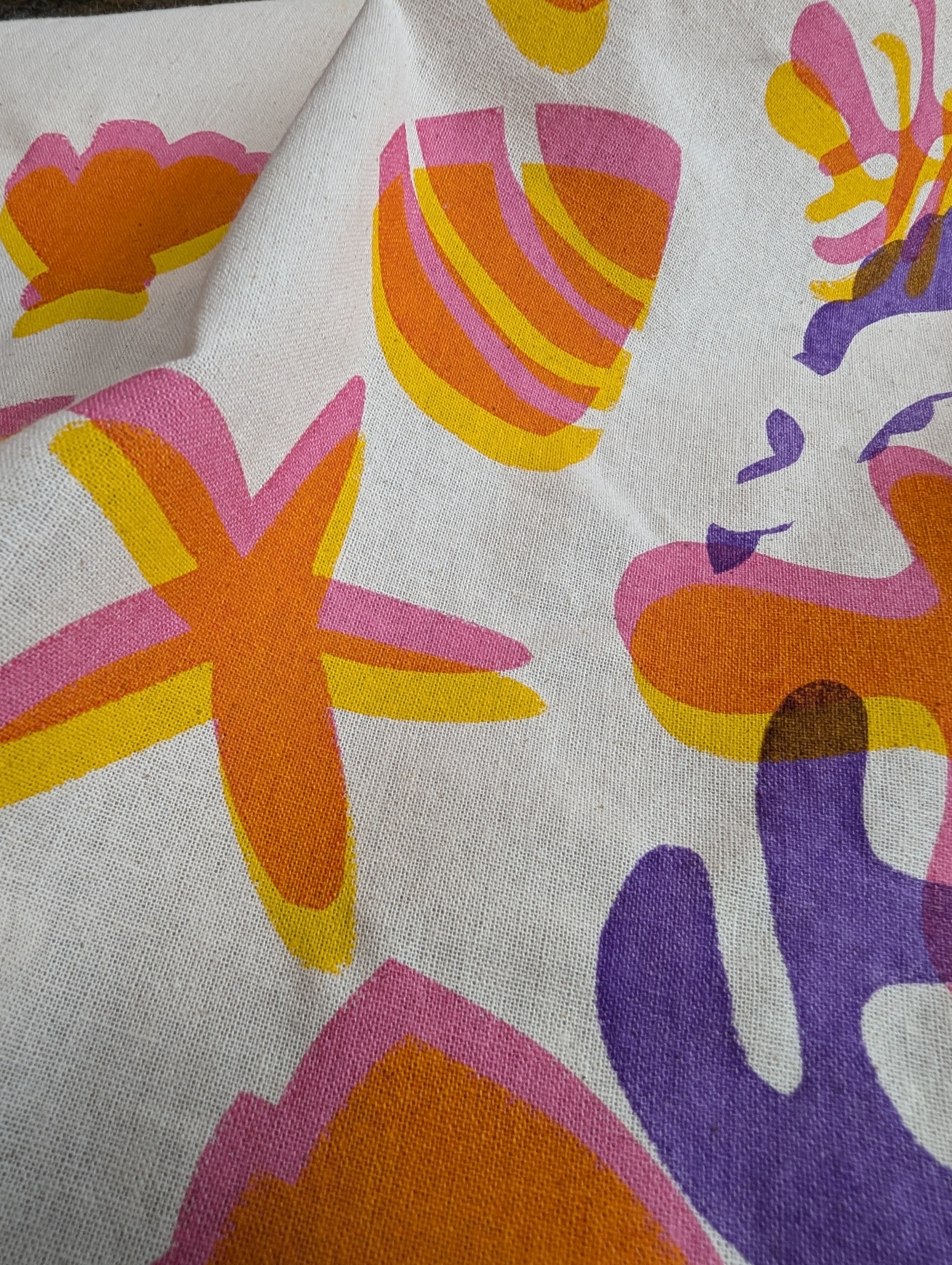 Feel free to bring your own fabric to print on. Natural fibres only please as the inks used are best suited for fabrics such as cotton, linen or hemp. Light coloured fabrics are best.