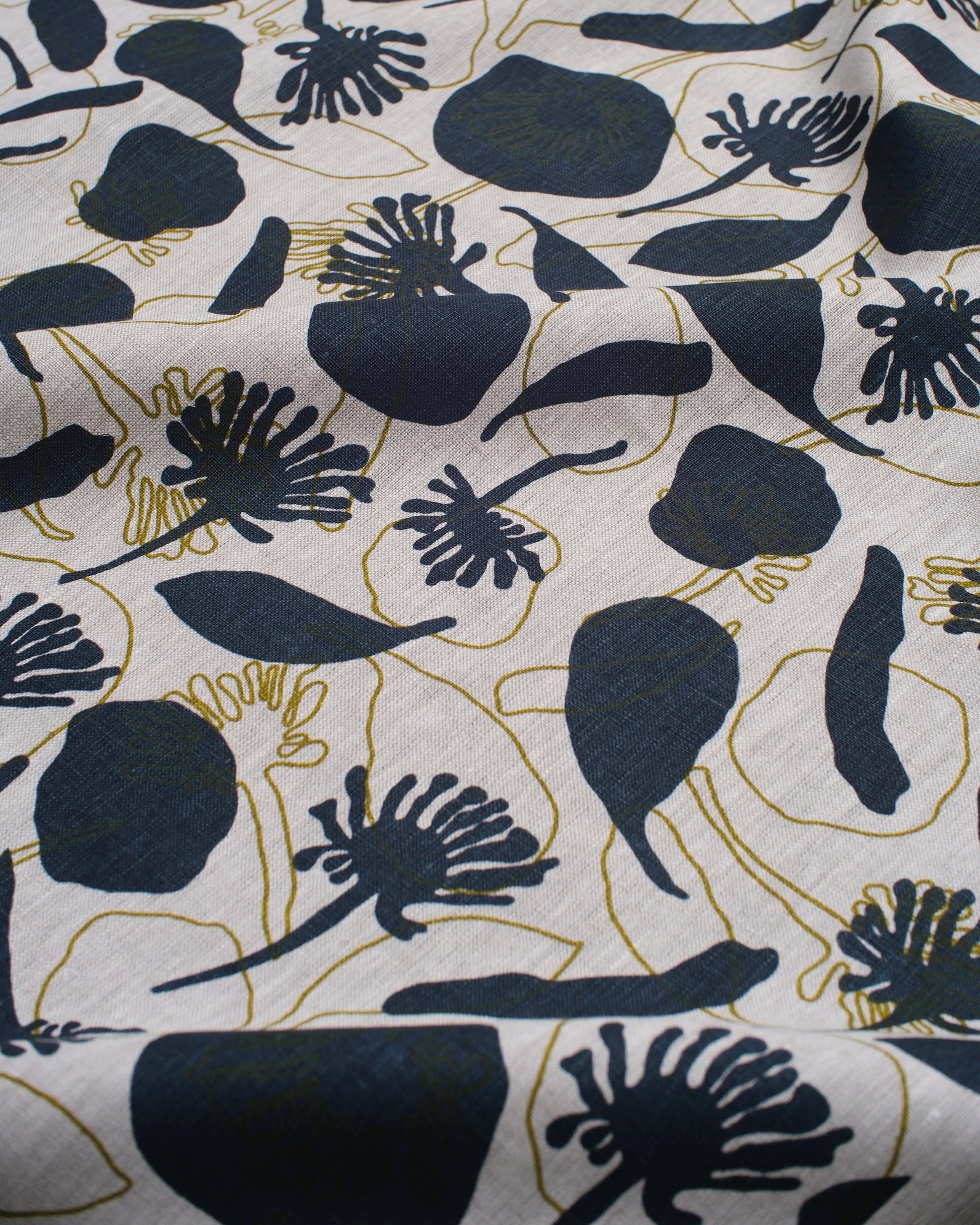 Linen Fabric - Seedpods in Indigo and Olive Oil
